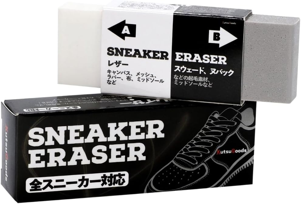 「クツグッズ スニーカーイレーザー」は、その名の通り、スニーカーについた汚れを消しゴムのように擦って落とすクリーナーです。2種類の消しゴムが1つになっていて、さまざまな素材の頑固な汚れ、ソール部分の黄ばみや黒ずみなどを効果的に落とすことができます。