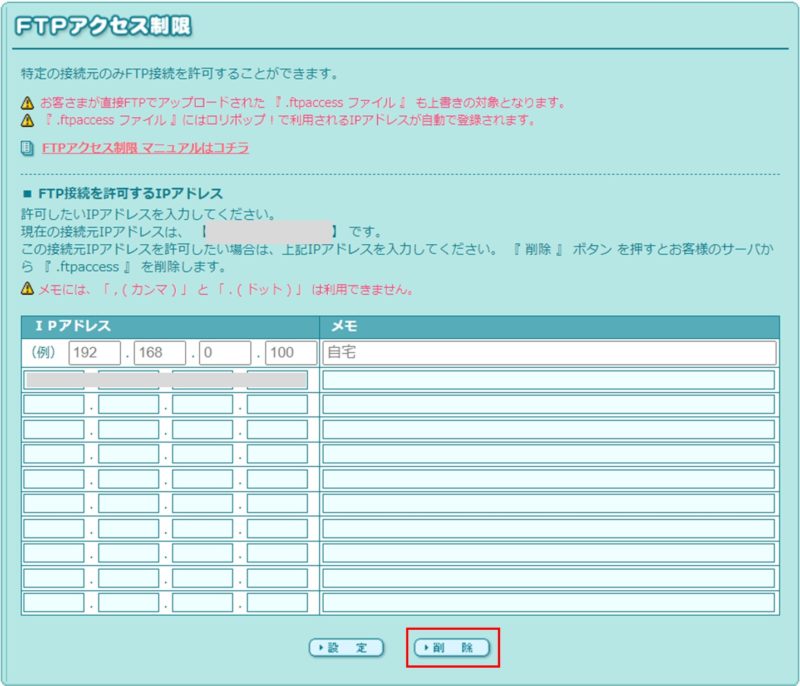 FTPアクセス制限を設定している場合、下の方にある[削除]をクリックします。