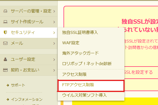 メニューから「セキュリティ」-「FTPアクセス制限」を選択します。