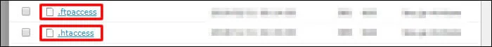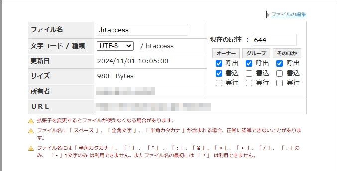 サーバーにアップロードされているフォルダやファイル一覧が表示されるので、この中から「.ftpaccess」と「.htaccess」の2つのファイルを探し、ファイル名をクリックすると編集画面になるので、両ファイルの名前を変更します。