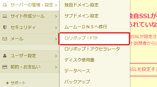 左サイドバーの[サーバーの管理・設定]にカーソルを合わせるとサブメニューが表示されるので、[ロリポップ!FTP]をクリックします。