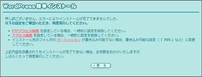 WordPress簡単インストール機能を使ってWordPressをインストールする時、上の画像のエラー画面が表示されてしまい、実際に試した推奨手順を紹介していきます。