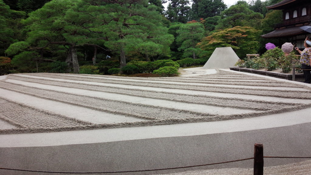 斜めに広がる白砂に向月台がアクセントを添え、モダンな雰囲気を醸し出す。何かと金閣寺と比される当寺だが、庭園の味は全く違う。前後左右上下から見る白砂は何かを問いかけるように佇み、禅の入り口に立っていることを自覚させる。なお、東求堂同仁斎は公開していることも多いので、立ち寄るのも良い。