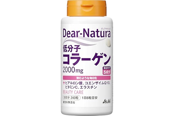 アサヒ ディアナチュラ 低分子コラーゲンは、手頃な価格で初心者にも始めやすいコラーゲンサプリです。1日分8粒で2000mg摂取でき、コラーゲンの働きをサポートするビタミンCのほか、ヒアルロン酸、コエンザイムQ10、エラスチンなど美容をサポートする成分もバランスよく配合されています。